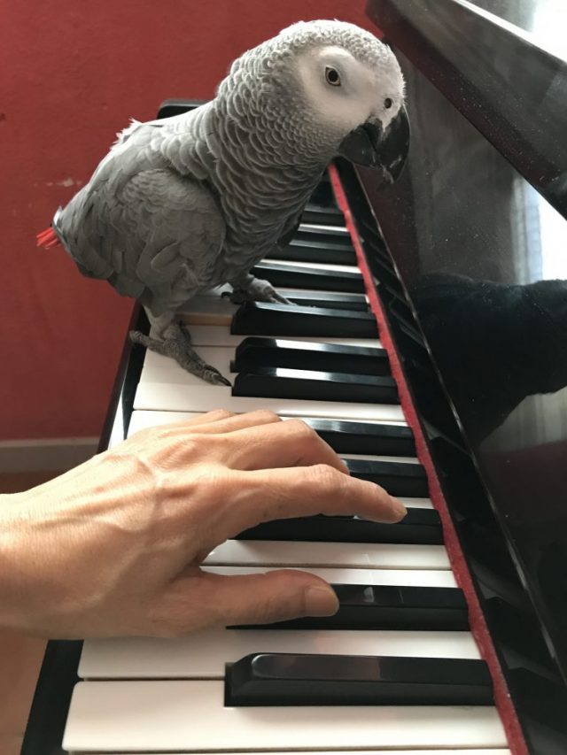 さて、ピアノを弾いていると必ずやって来るオウム。それだけでなく、時々先にピアノ室へ飛んで行き、私を待っている(写真)。