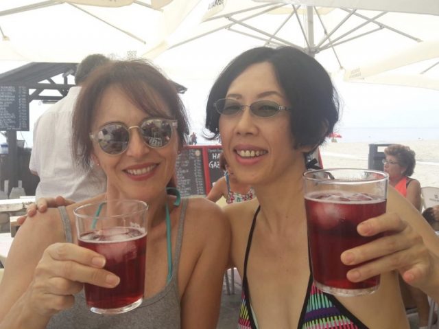 この日はセビジャーナス教室の仲間と三人で海へ。まずは海岸通りのチリンギート(魚介類レストラン)でランチ。赤ワインのソーダ割りで乾杯〜。