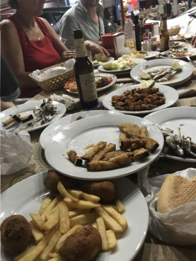 四枚目の写真をご覧ください。マナーも何も。皿の上に皿が。重ねて置かれ食べ続ける(笑)これぞマラガ的夏の大夕食会。