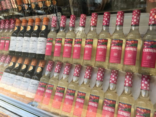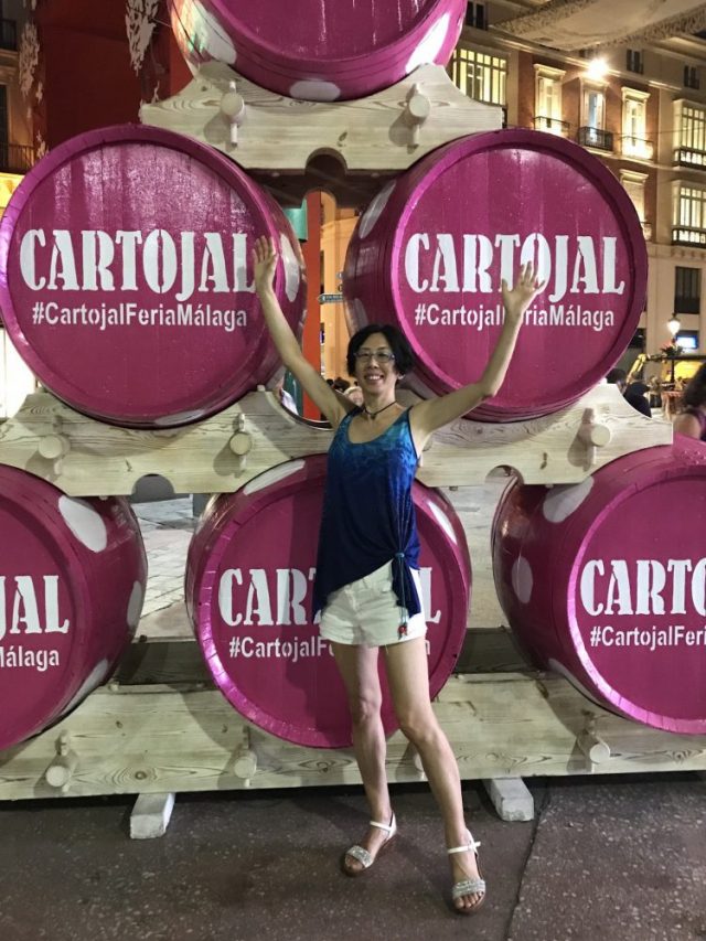 マラガのセントロには日よけの天幕が張られ、フェリアで飲まれる甘口白ワインのカルトハルの樽も!フェリアムードいっぱい。