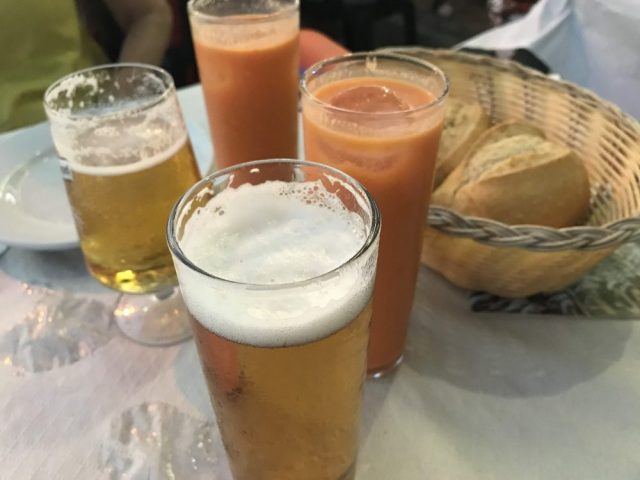 散歩の後は、海岸通りのチリンギート(魚介類レストラン)へ。もちろんテラス席。まずは生ビールで乾杯。そして夏の生野菜スープ・ガスパチョでスタート。