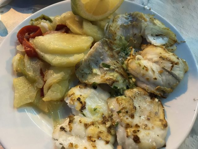 スープとはいえお皿でなく、細長いグラスでごくごく飲みます。これぞマラガ!おいしい〜。そしてメインの魚料理へ。