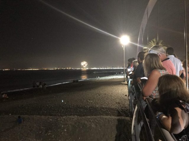 これで夜の11:30。再びよろよろと歩き出す。目指すはビーチにある橋の上。12:00ちょうどに「フェリア開始」を告げる花火が上がるのを一目見るため。