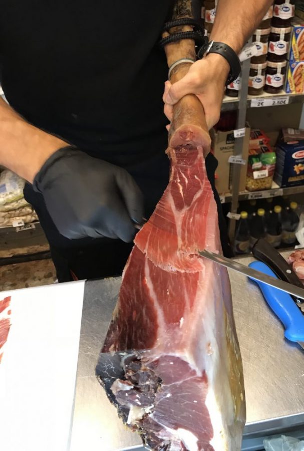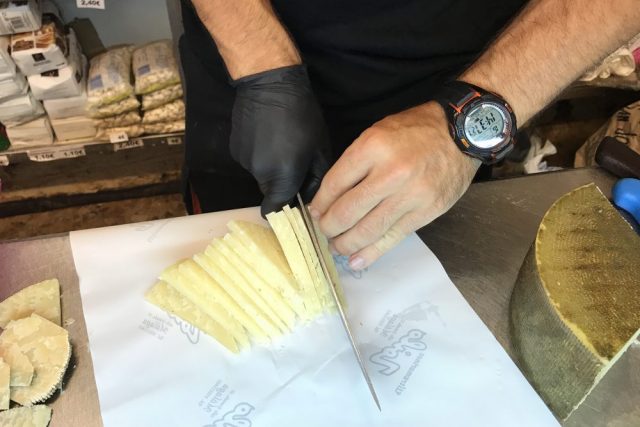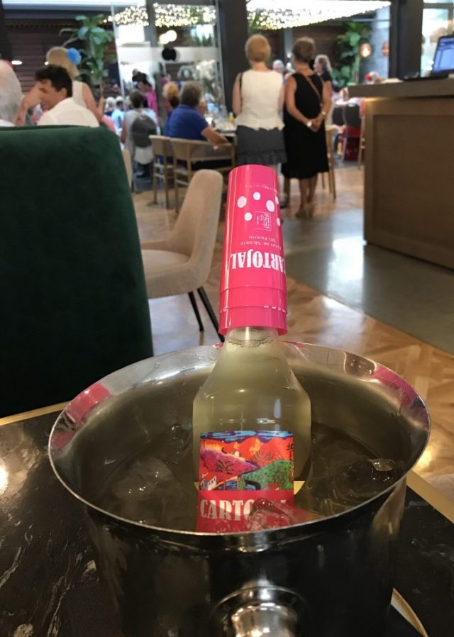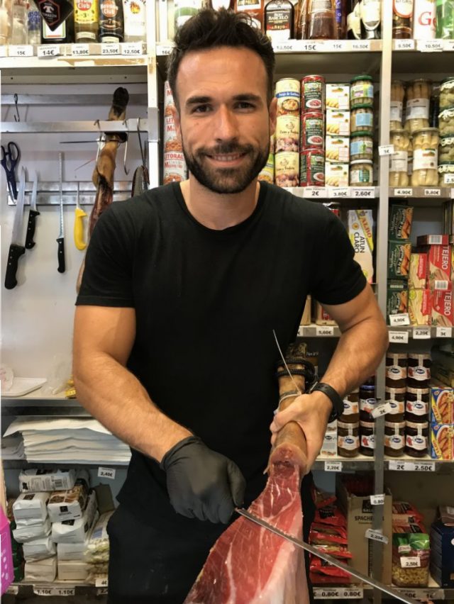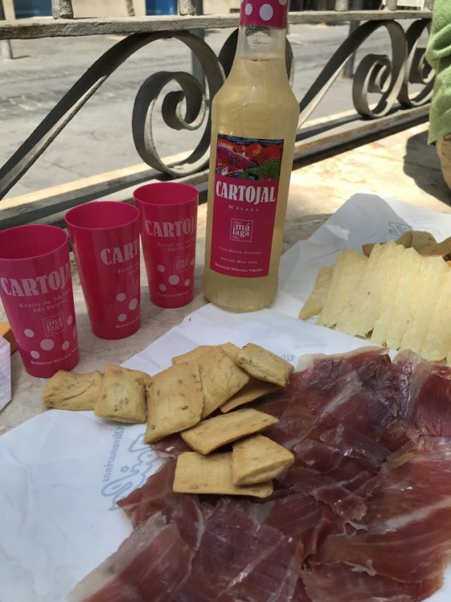 続いて、フェリアで飲まれる甘口白ワイン「カルトハル」と「生ハム&チーズ」をお店で購入。これを持ってメルセー広場へ。そう、木陰で飲んで食べる(笑)ピクニック気分。