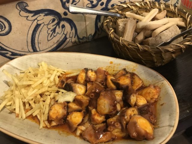 さて、この日はハビ吉とホセとセントロめぐり。まずはバルでビールで乾杯。この「カウンター立ち飲み」スタイルもスペイン的。タコをつまみに。おいし~。