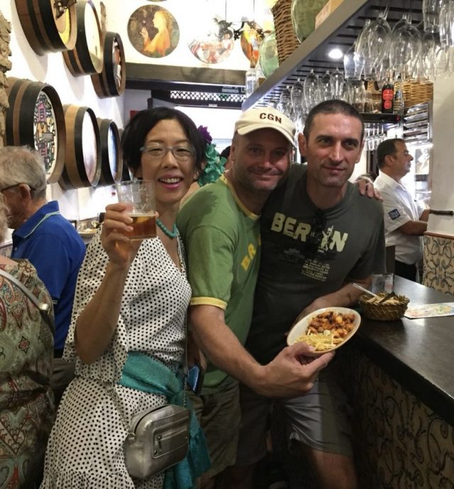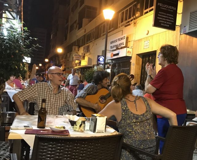 さて、夕食は庶民的なバルへ。ポーラや鳥の串焼きなど食べていたら、お隣のテーブルでお客さんが歌い出す。ギターリストは流しでフラメンコを弾いたり歌ったり。伴奏したりしてフェリアムードいっぱい。
