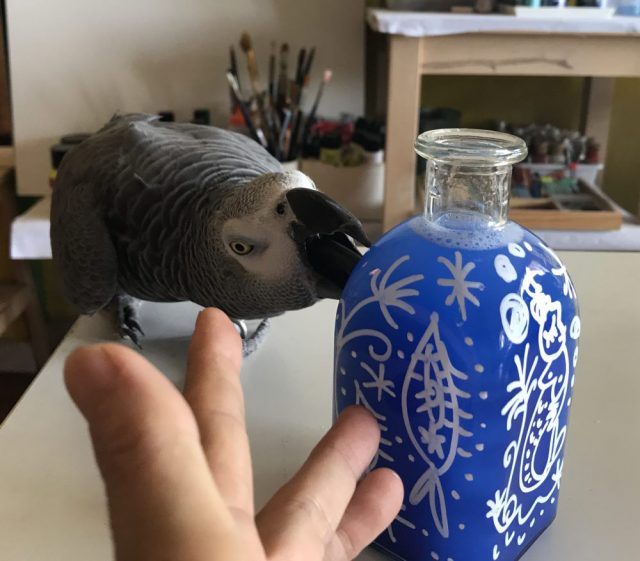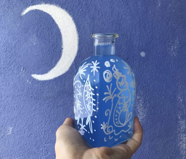 棚の奥からガラスのボトルが見つかり「捨てようか」と迷った。が、ふと気まぐれで「人魚」を描いてみたくなりペンを取る。
