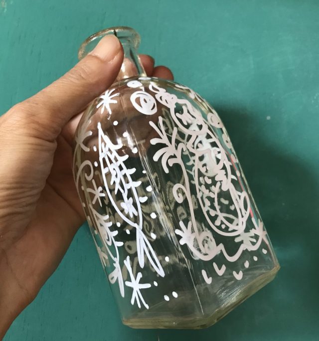 透明のボトルに白のマーカーで描いたから、よく図柄が見えない。