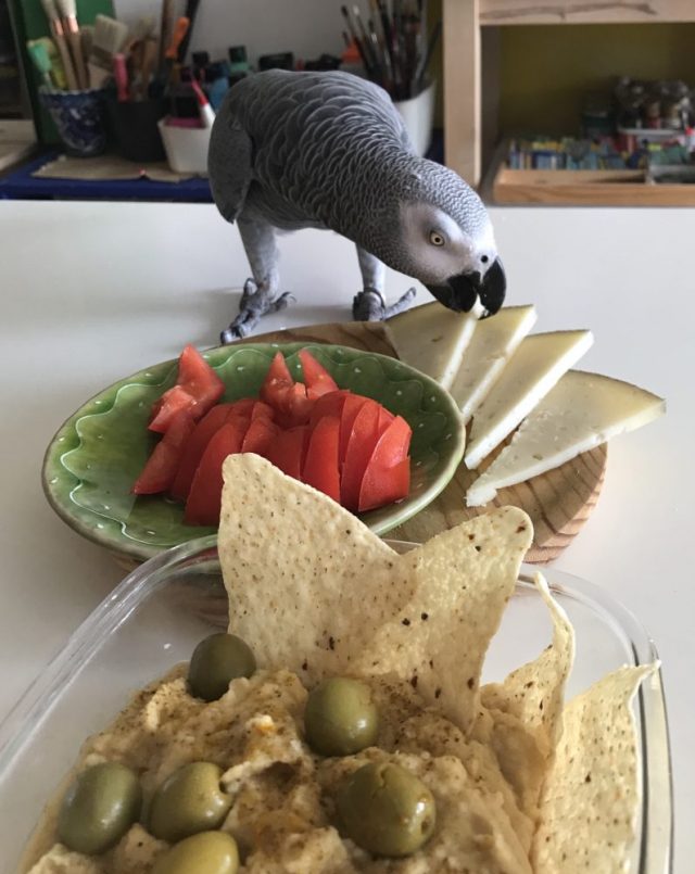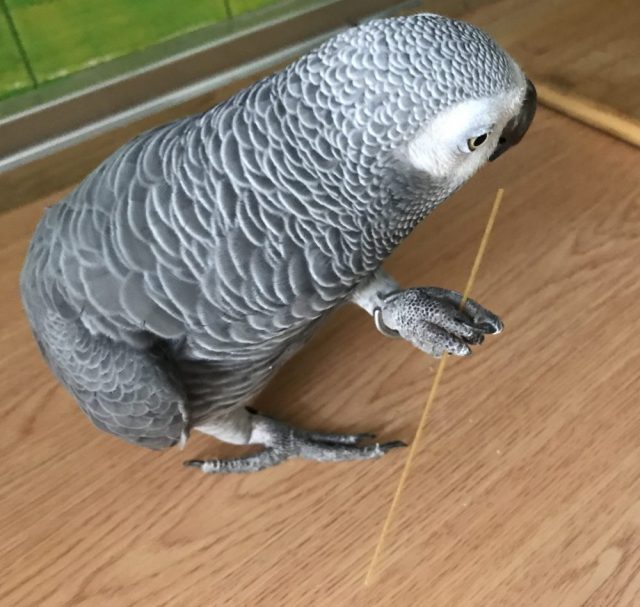 その横でオウムはスパゲティを盗み食い。それも茹でる前のやつ。「パキパキ」って音たてながら「生食」。すごいな。