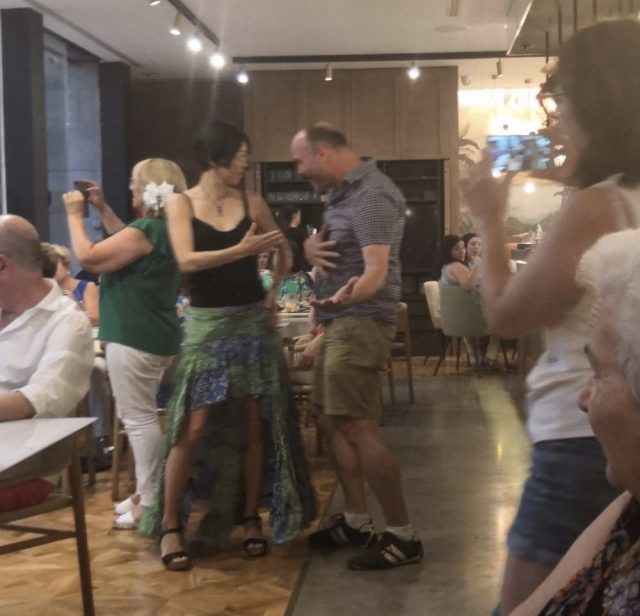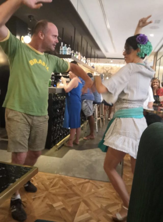 「動いているからうまく撮れない」とのコメントつき。写真を見ればわかりますが、カフェテリアやバル、どこでも踊ります。フェリア中は(笑)音楽がかかればさあ、すぐに!