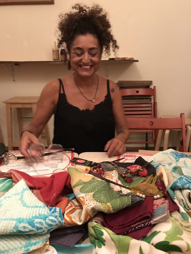 オリエンタルな料理をつまみながら「過ぎ行く夏」に乾杯。「大須で購入した着物生地&かんざし」を持参して、皆さんにもらっていただく。