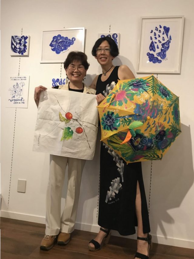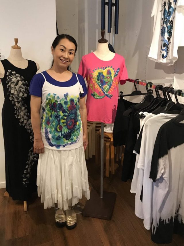 今回の展示作品の半分以上は「シャツペイント」。なので、さっそく作品を身にまとってマネキンになっていただきました。かわいい〜。