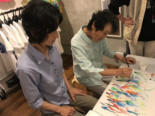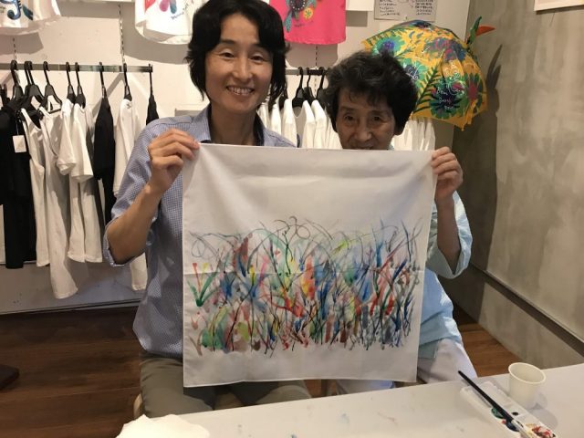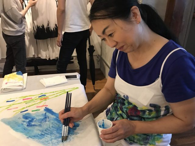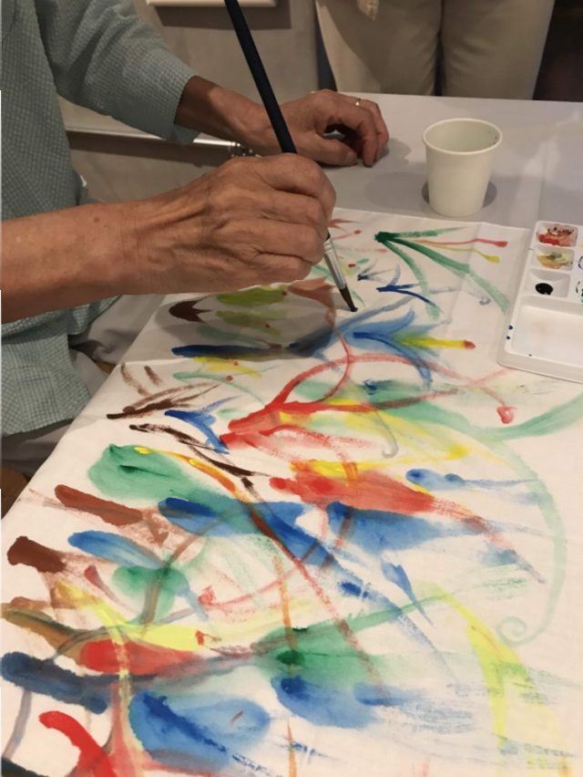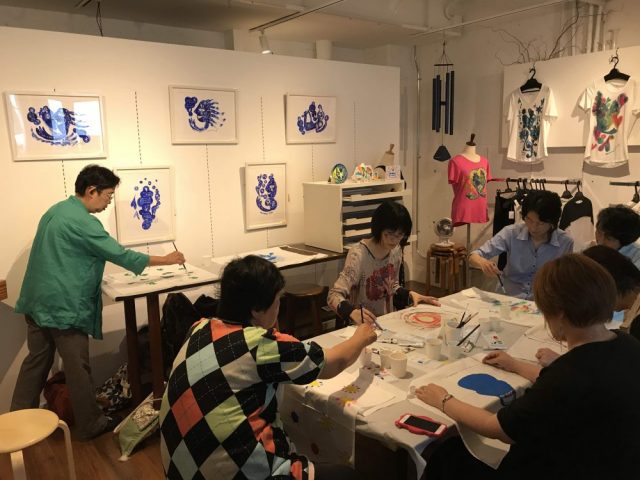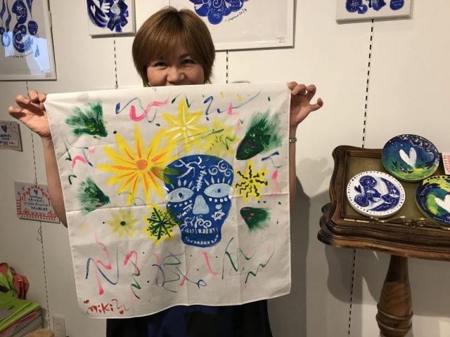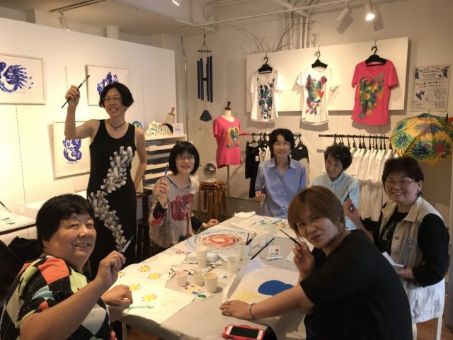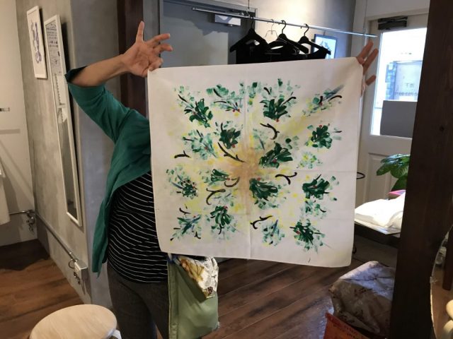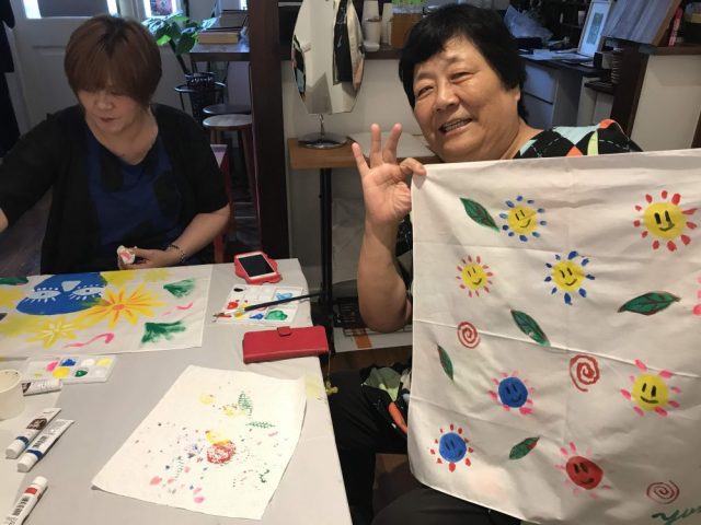 お昼過ぎから「ワークショップ」を開催。今回は布用の絵の具を使って