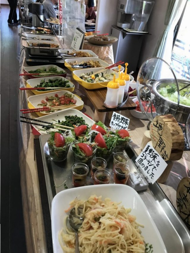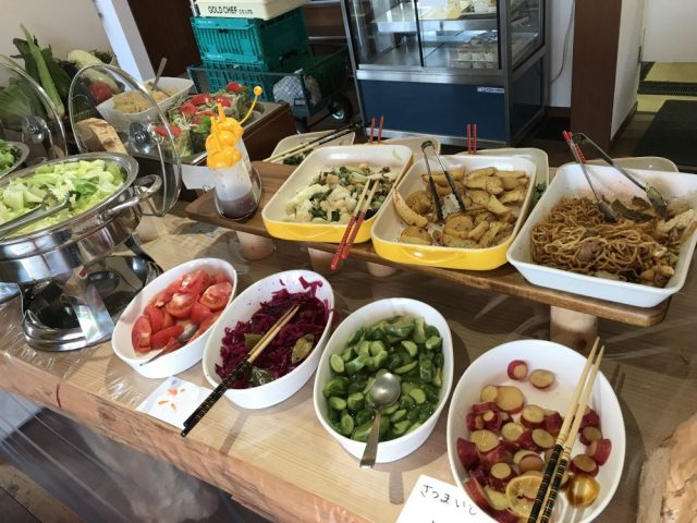 これがおいしいのなんの。もう品数がめちゃ豊富な野菜中心バイキング。身体によさそう〜。焼きたてピザなども釜から出された熱々をいただけますよ。