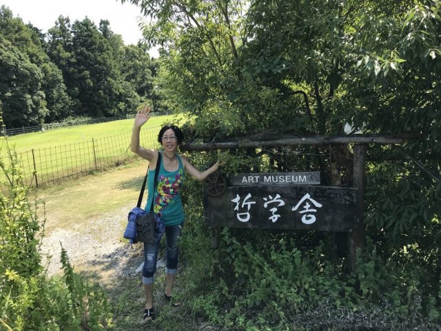 さて、いよいよ山道を越えて「哲学舎」さんへ。木陰にひっそりとたたずむ美術館。手作りの看板を見つけなければ、そのまま通り過ぎてしまいそう。まさしく隠れ家。