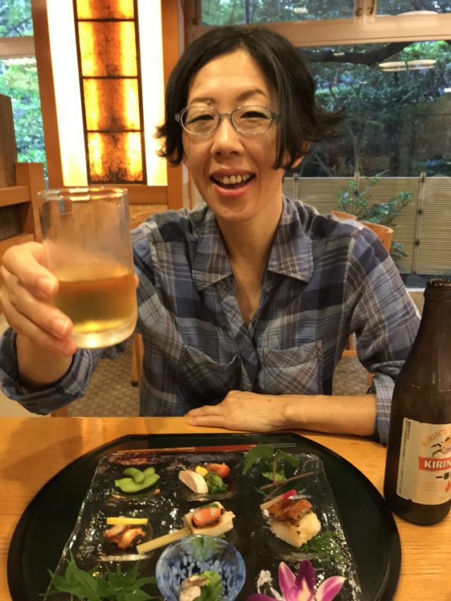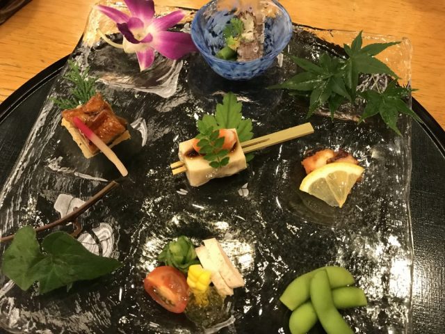 この日は懐石料理だったので、なんとなくお上品な雰囲気。前菜から始まり、お刺身、焼き魚、肉料理、鍋まで。おいしい〜。うれしい〜。冷房がきいているから食欲も復活。