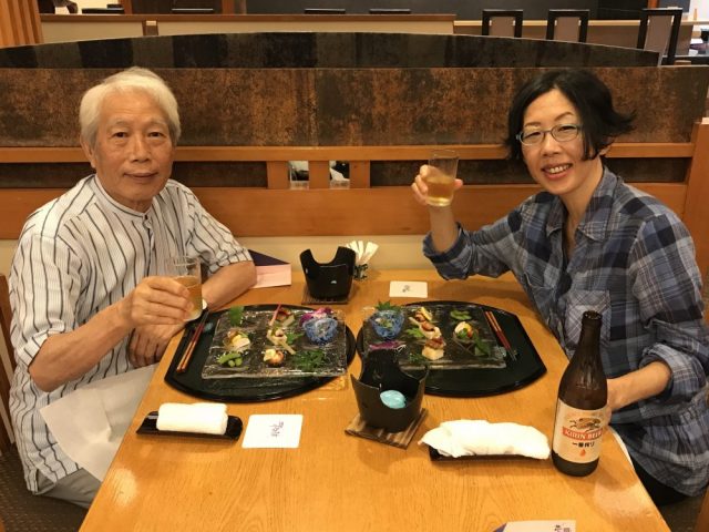 さて、温泉の後はお待ちかねのビール。まずは父と乾杯。「お疲れ様でした〜!」「二人とも元気でよかったね」