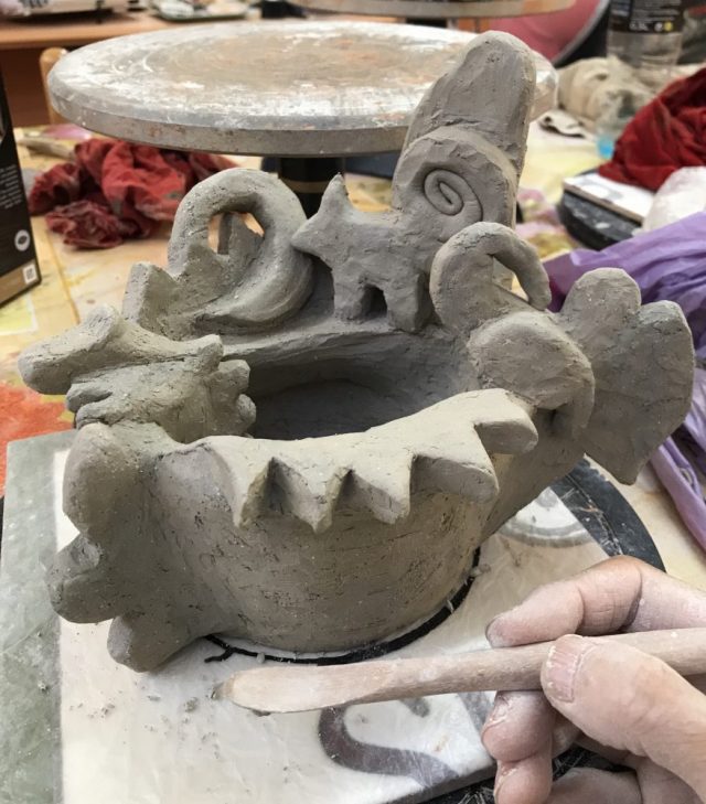 初心者は手始めに食器や壺を作る。はずがいつのまにか不思議な「物体」に(笑)。下書きや完成予想図もなく形にするので、先生の方がびっくり。