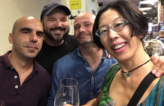 で、必死で駆けつける。レッスンが終わったその足で。すでに9時半過ぎ。まずはワインで乾杯。濃厚なチーズ、イカ、肉をおかずに近況報告。