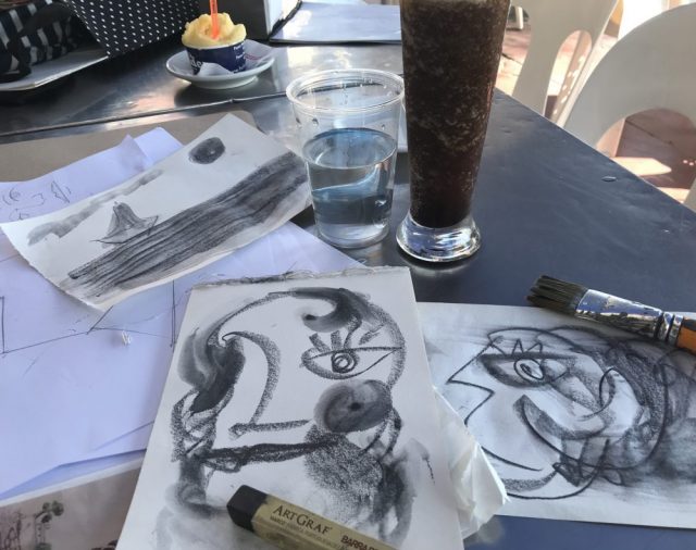 しばし私たちはカフェテリアのテーブルで、スケッチに明け暮れた。まるで美大生のように。50歳過ぎの大人が、一本の水彩パステルで大はしゃぎする。