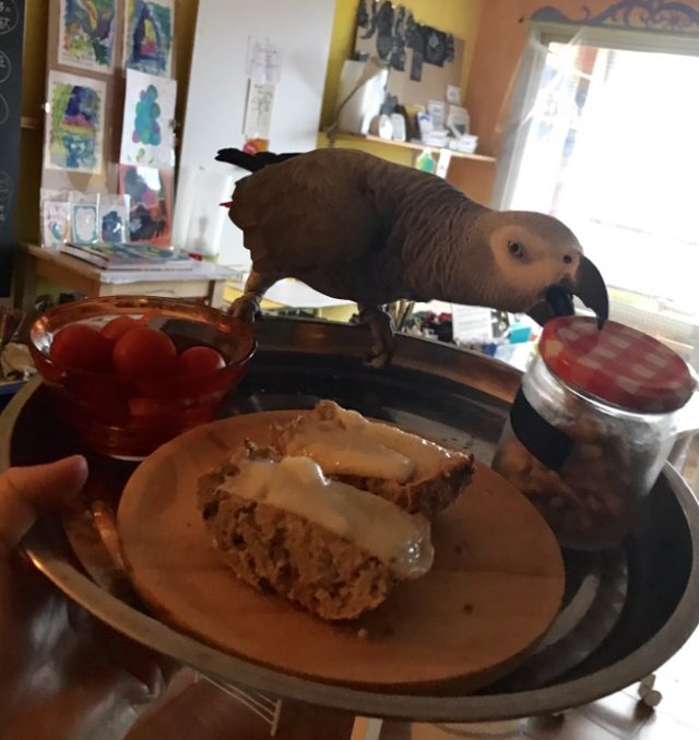 で、お盆に朝食を乗せて運ぼうとしたら、なんと。オウムがついてきた。お目当は「クルミとチーズ」。