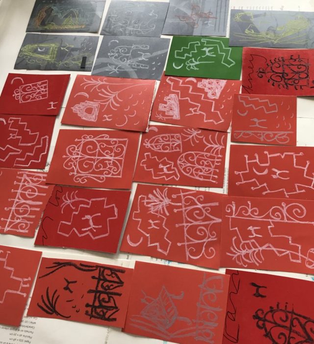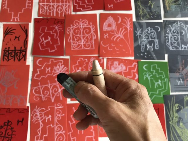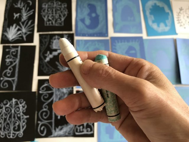 で、紙切れにクレヨンで落書きスケッチ(写真)のつもり。が、気がつくと10枚、30枚、50枚・・・。