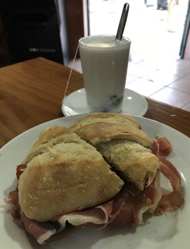 乗り換えバスを待つ間、行きつけの家族営業のカフェテリアへ。熱いミルクティと生ハムサンド。このおかげで、午後4時の遅いランチにも耐えられる。