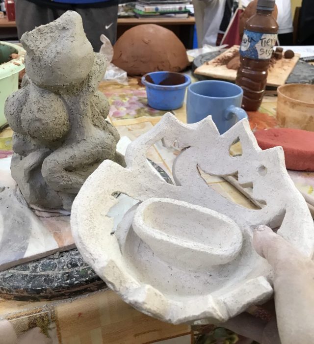 これまで紙やキャンバスなど「平面に描いていた」ものを「立体」にできる。その歓びと刺激で、粘土にもう夢中。楽しいのなんの〜。