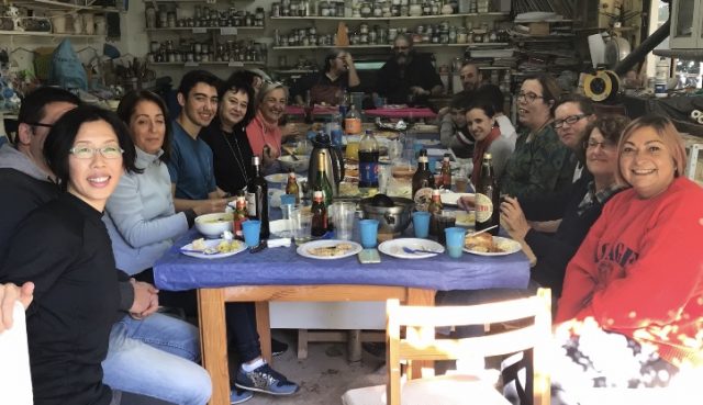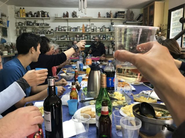 昨日の続き。「ピット・ファイアリング」の1日実習。全ての作品が釜に無事入り、さっそく始まる「打上げランチ」。