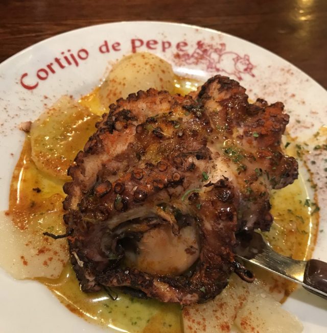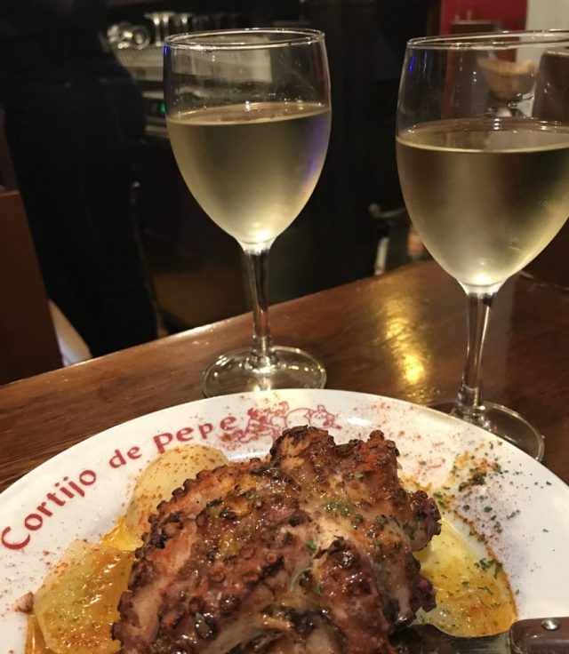 まずは白ワインで乾杯。こんなちゃんとした料理が「カウンター」で食べられるのもスペインの魅力。