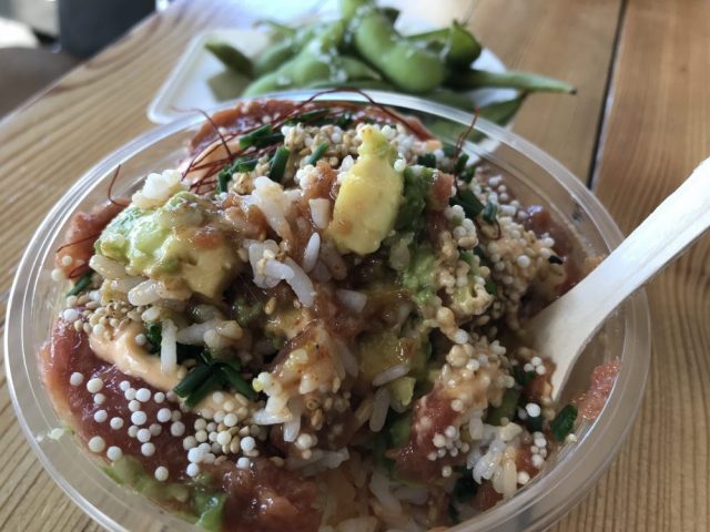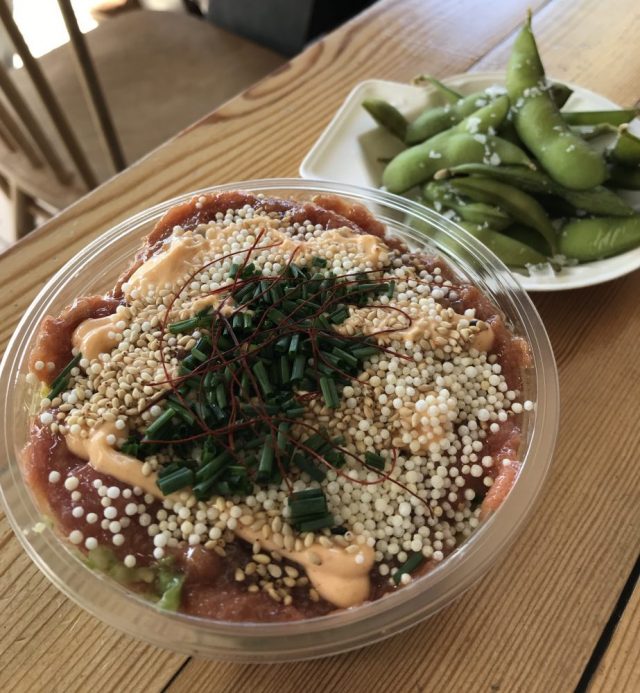 ひとことで言えば「マグロ&アボカド丼」。メインの具はこの2つ。に、トッピングで枝豆や野菜などを足していく感じ。