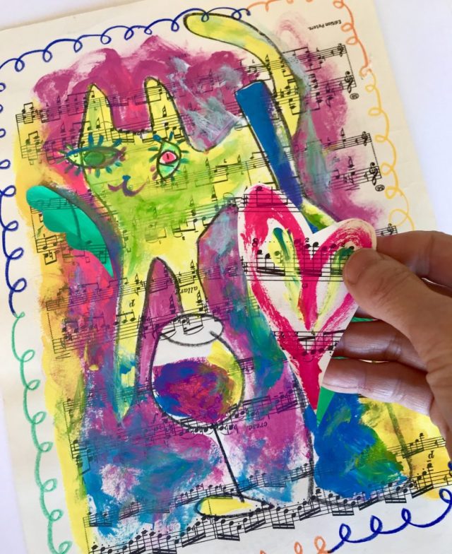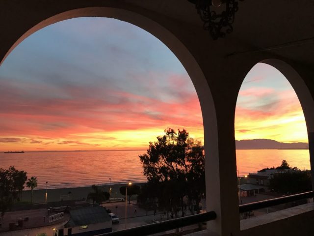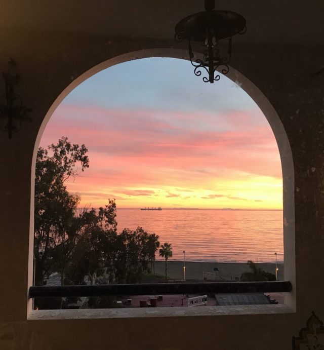 【写真】今日は一日中「地中海猫アラモール」のコラージュ制作。白い壁がピンクに染まるほど強烈な夕焼けが届けられた。
