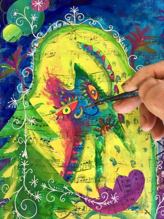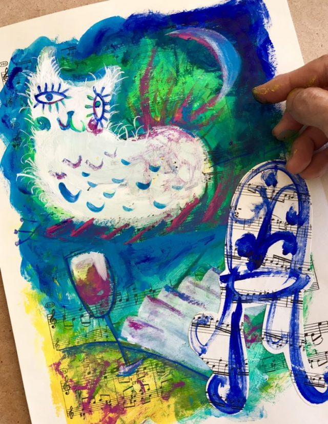 コラージュ画は、パーツを貼り付けるたび「一晩寝押し」。作品が出来上がるまで何回も「パーツ貼り&寝押し」をくり返す。