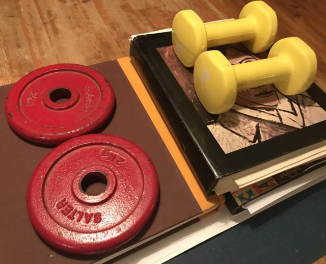 誰が?「本と鉄アレイ」が。本の中でも分厚くて重い「美術書」が最強。なんとピカソ大先生も「押し」に協力してくださっている(写真)。
