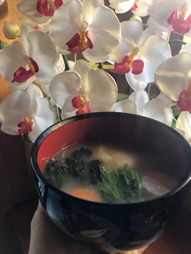 そして母の祭壇コーナーには、同じ「おせち風朝食」が並んだ。出来立てのお雑煮とあったかい甘酒も一緒に。