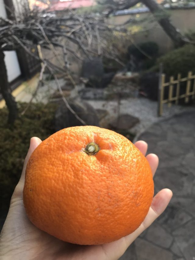 大整理がひと段落ついたところで、庭に出て深呼吸。父の友人・滝澤さんからもらった青島みかんをいただく。おいしい〜。