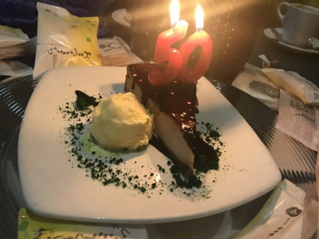 こっそりバースデーろうそくを持って行く。ケーキ皿の周りには日本のおせんべいとお饅頭が飛び散る(写真)これをお店で食べてしまうところがマラガ(笑)オーレ!