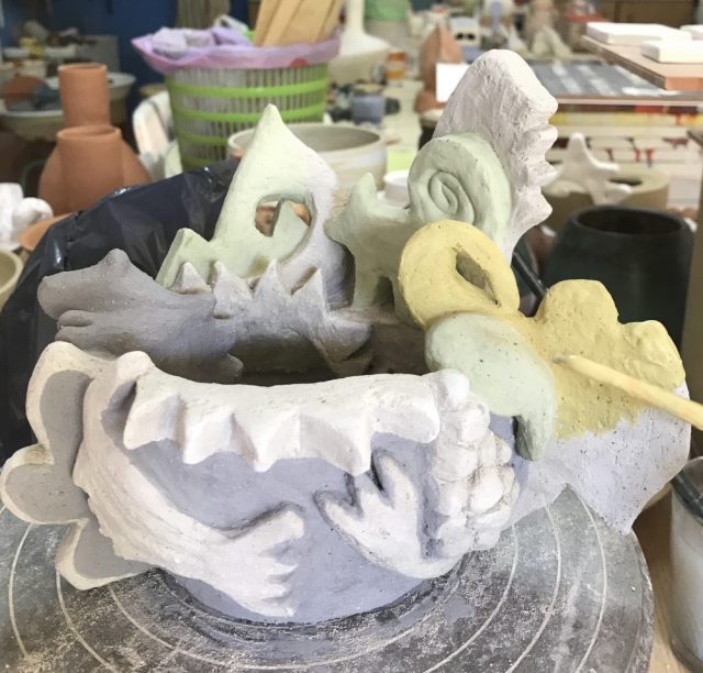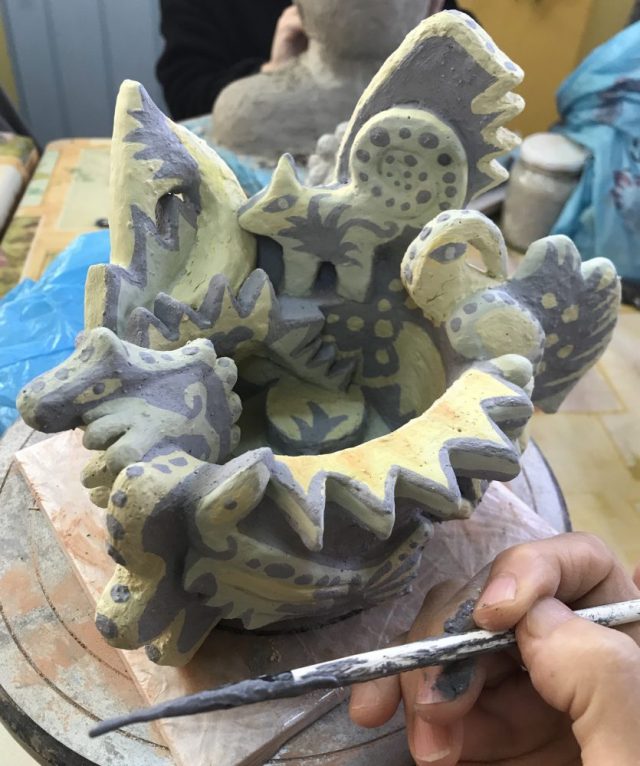 陶器教室が再開。1ヶ月遅れた分を取り返すべく一気にペイント。陶器のおもしろいところは「塗っている色と出来上がりの色が違う」ところ。なのらしい。