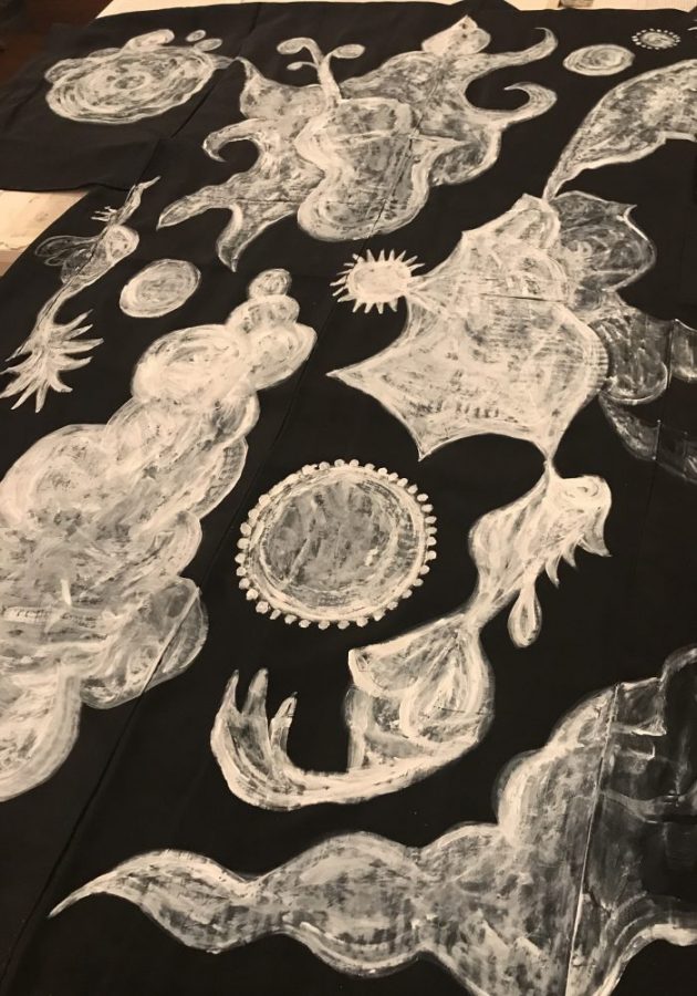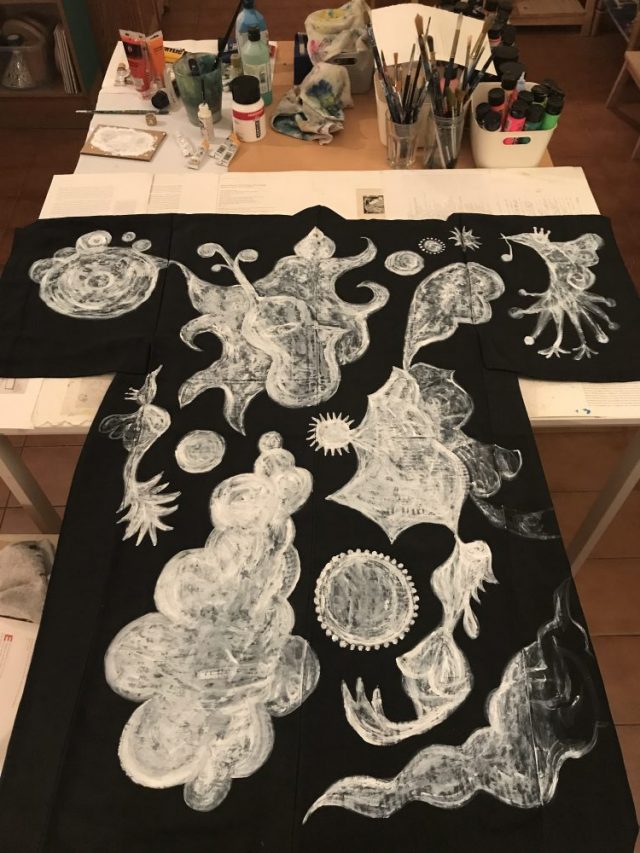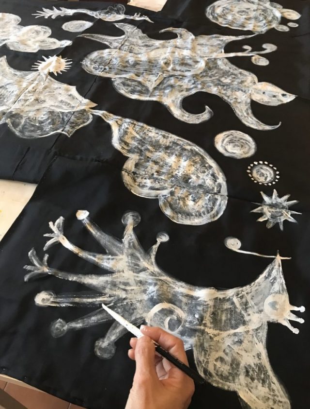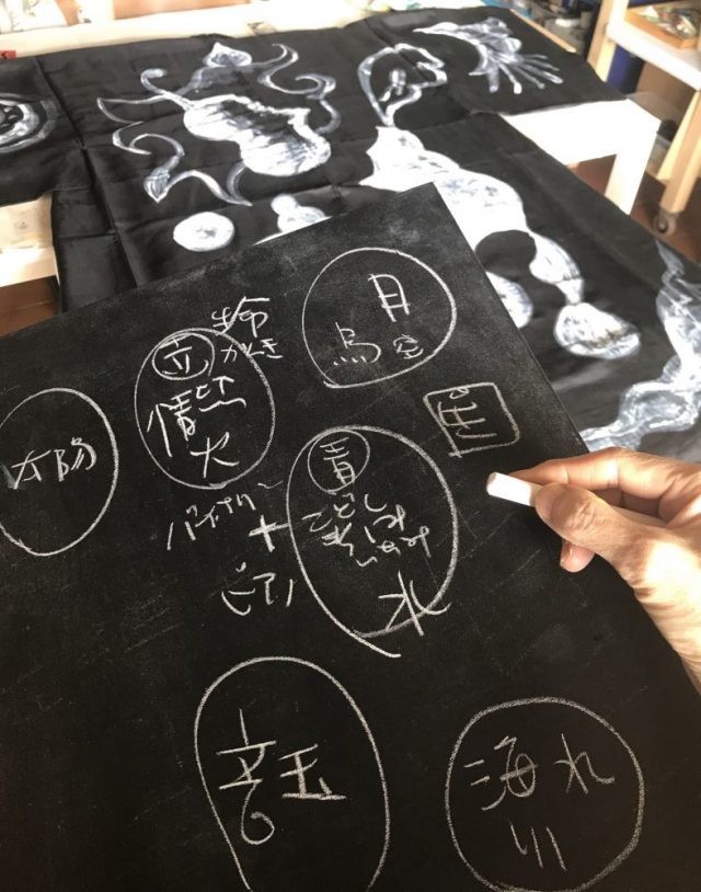 着物の生地が黒なので、まず「白」で全体のイメージをペイント。具体的なモチーフ決めやスペース配分などを行う。