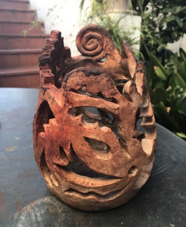 今回、共同展に出品するのは「古着物ペイント」と「陶器」2点。記念すべき処女作「羽の生えた土器」はピット・ファイアリング(野焼き)で作った。