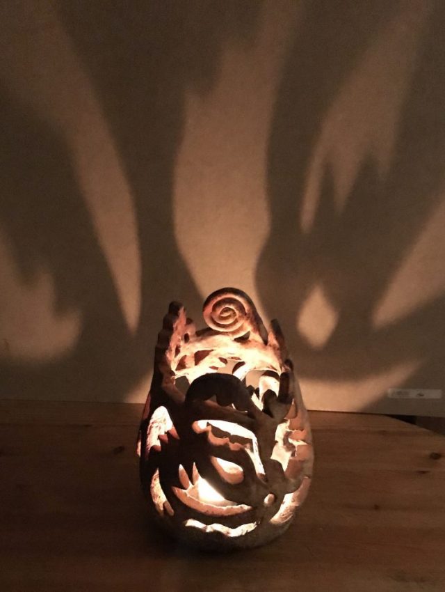 本当は「ろうそくを土器の中に入れて」展示したい。火が、背後に大きな「羽」を浮かび上がらせ、まさしく「羽の生えた土器」になる。でもセキュリティ上、無理だろうなぁ。