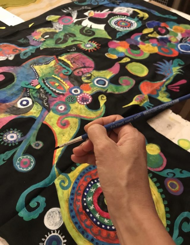 まずは「古着物ペイント」の完成めざして猛ダッシュ。締切間近につき、急きょ月曜日はレッスン臨時休講。ご迷惑をおかけしております。全力で描いていますので、よろしくお願い致します。