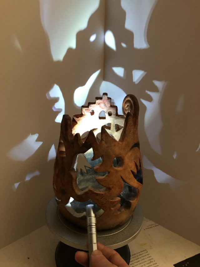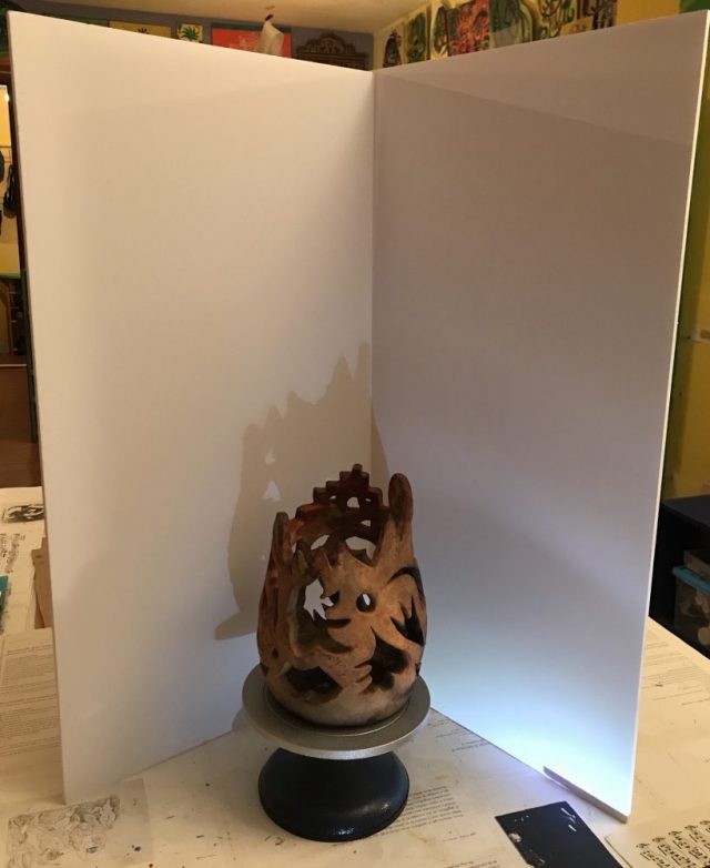 レッスンの合間の10分や30分を利用して「土器の展示方法」を考え、あれこれ試す。白いパネルをバック置き、懐中電灯で「穴」から土器を照らしてはどうか(写真)。