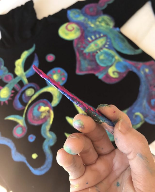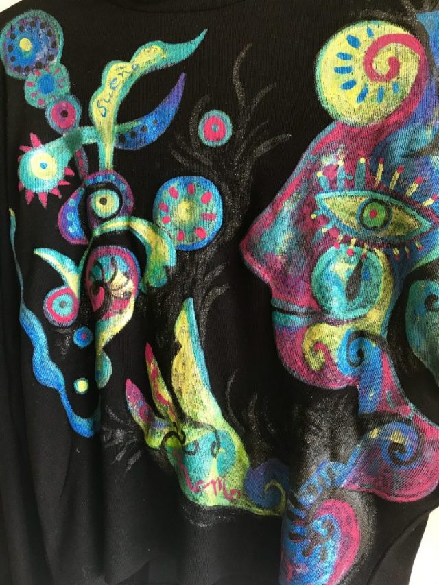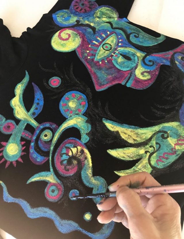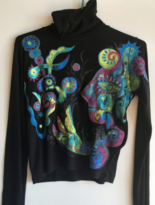 今回、初めて薄手のセーターにペイント。これまでは夏向けのシャツやワンピースが中心だったので、かなり手間どった。