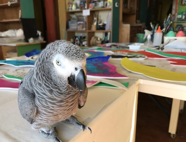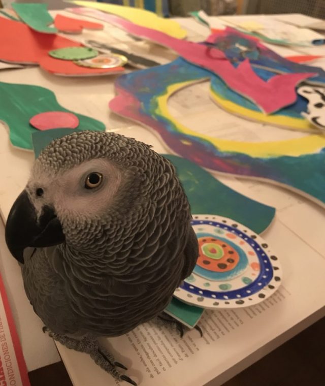 うちのアトリエではめまぐるしく素材が変化する。着物、紙、カートン、コラージュパーツ、セーター。アクリル絵の具、習字の筆、墨汁、布用の絵の具、マーカー・・・