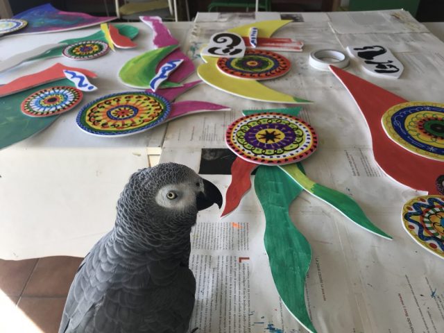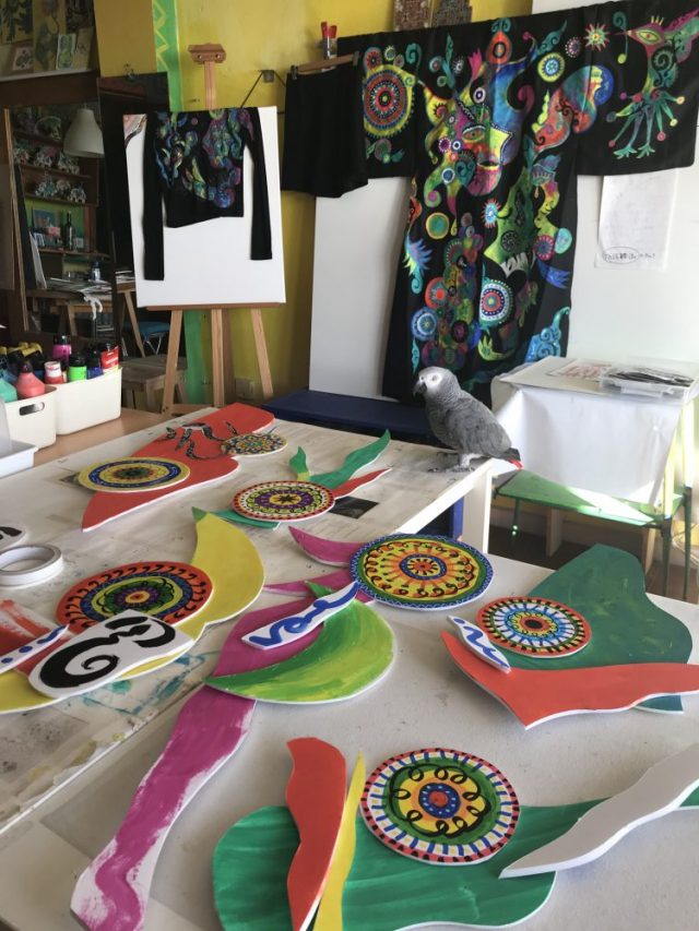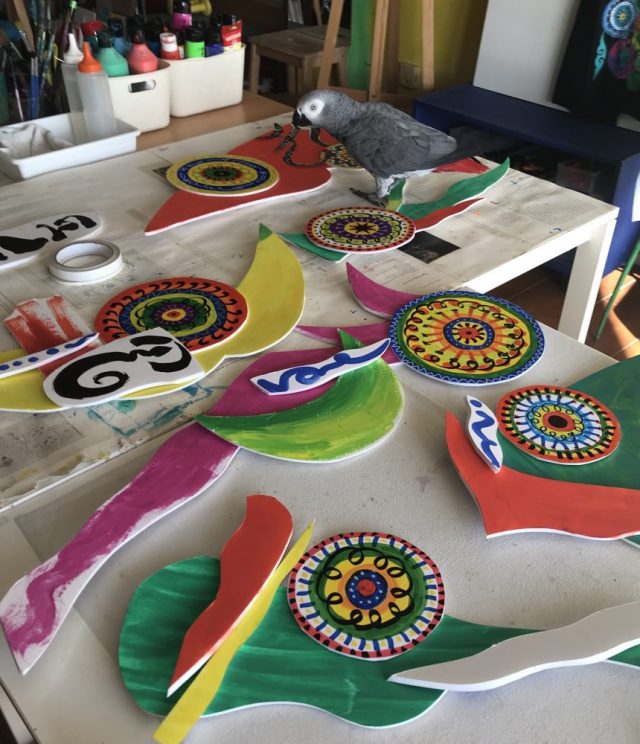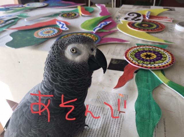 というわけで、8点のコラボンアートを制作中。追い込みのこの忙しい時に、オウムはアトリエのテーブルをよちよちと歩き回る。