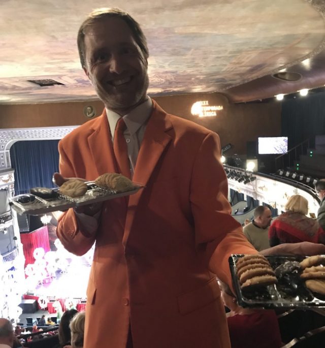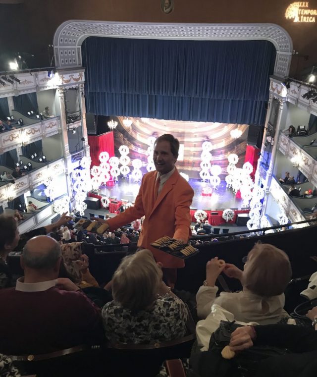 席に座れば、クッキーを手にしたお兄さんが客席の間を回ってくれる。とびきりの笑顔。またスーツが色鮮やかで。