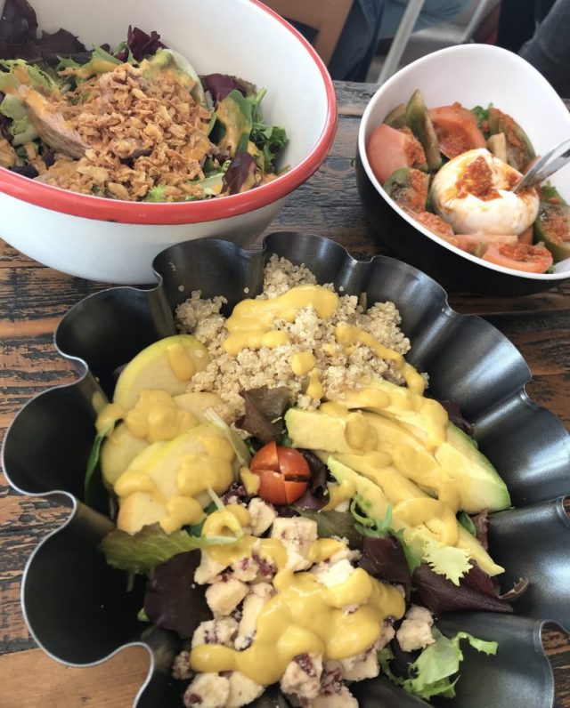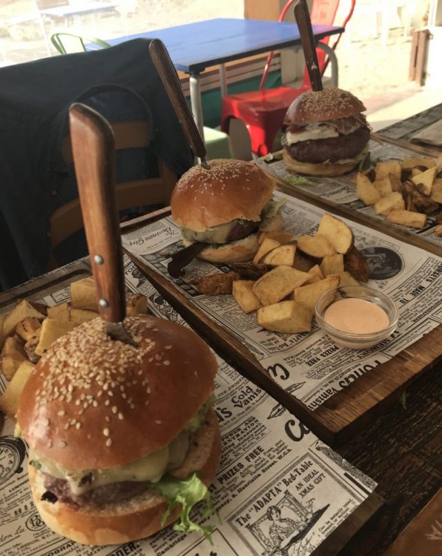 聞けば「本日のおすすめ」は「ハンバーガー&サラダ」とのこと。それが頼んでびっくり。ものすごいボリューム。飲んで食べてこれで一人15ユーロ。