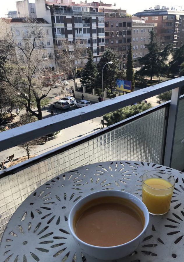 「冷蔵庫にしぼりたてのオレンジジュースと今朝作ったガスパチョが入れてある。フライパンにはチョリソーがあるから。それでランチして」