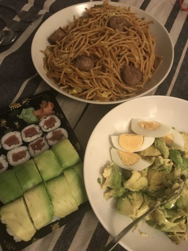 思うに、ハビ吉は家庭的なのではないか。私とは何かが根本的に違う。というわけで、今夜は寿司と焼きそば、サラダ。